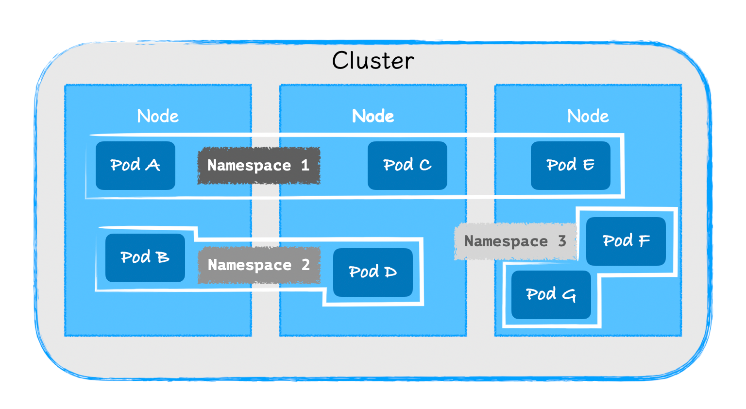以上圖為例,在一個 k8s cluster 中有許多 Pod (k8s 的最小運行單位),每個 Pod 會被 kube-scheduler 根據各種條件分配到不同的 Node 上運行,但使用者要如合使用 kubectl 來檢視這些 Pod 呢?這時 Namespace 的重要性就體現出來了,假設 Pod A、C、E 是屬於同一個組的軟體,這時使用 Namespace 將他們邏輯性的圈起來竟可以更方便的管理和檢視了。
